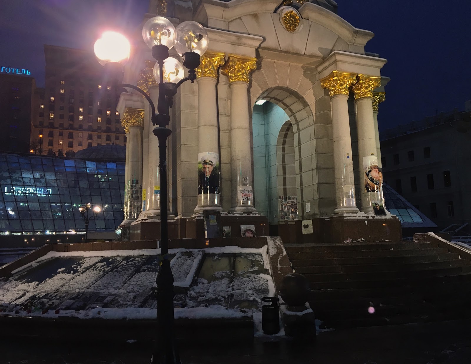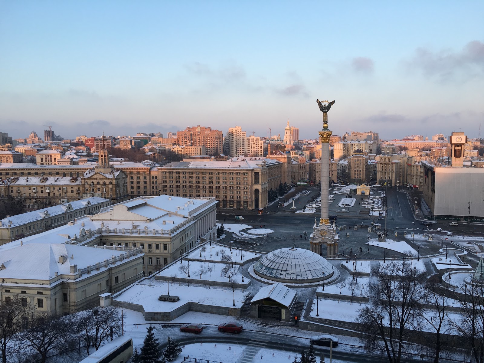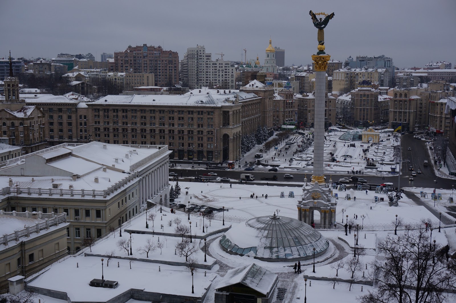 Kaupungin eräänlainen sydän on Maidanin Aukio eli virallisemmin Itsenäisyydenaukio (Майдан Незалежності). Aukiolla sijaitseva valtava Äiti-Ukraina monumentti on peräisin vuodelta 2001. Maidan on tullut surullisen kuuluisaksi erityisesti vuoden 2014 verikapinoista, joissa ammuttiin kymmeniä siviilejä entisen presidentin käskystä. Ampujat linnoittautuivat ja ampuivat Hotel Ukraine'n ikkunoista. Kyseessä hotelli jossa yövyin. Jäätävää. Maidan on yhä edelleen suosittu paikka mielenosoituksille, joita tuli lähes päivittäin, ja niitä oli mielenkiintoista seurata ikkunasta.
