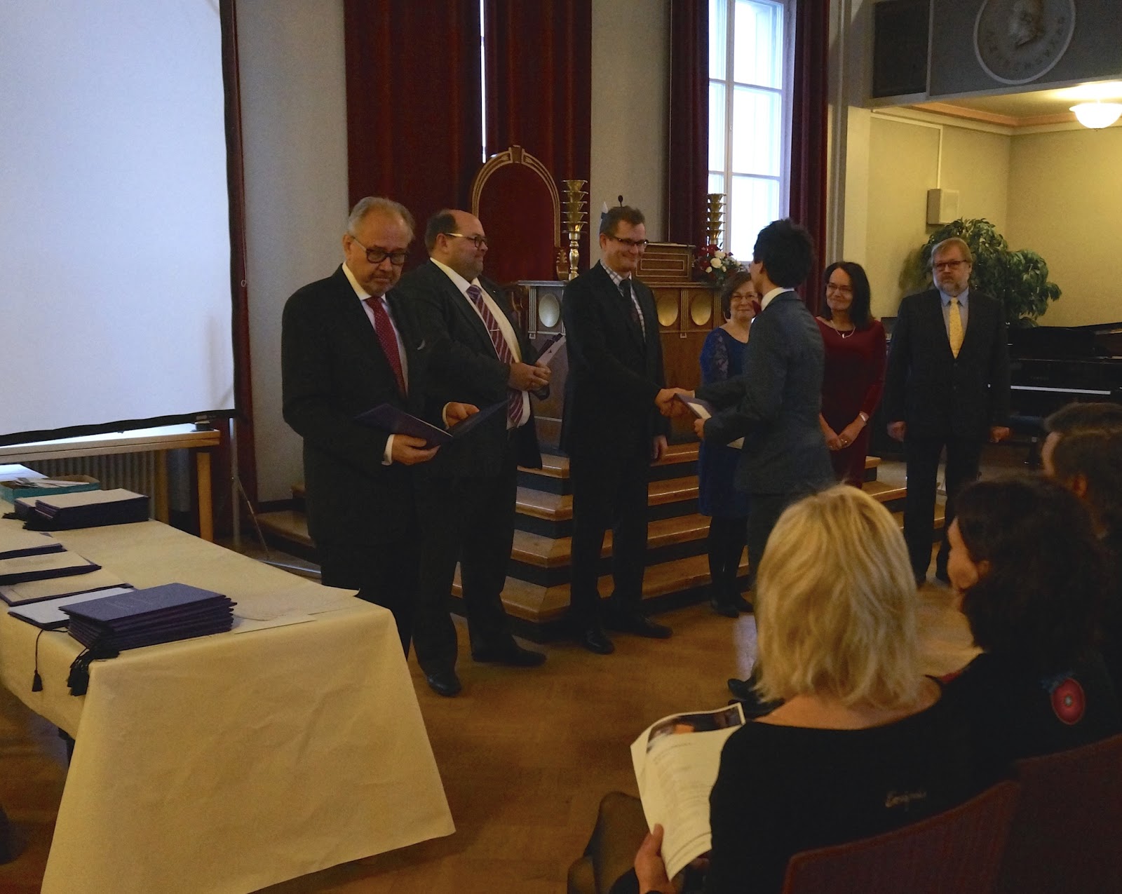 | Historiallinen hetki. Korkeakoulun kollegio ojentamassa tutkintotodistusta. |