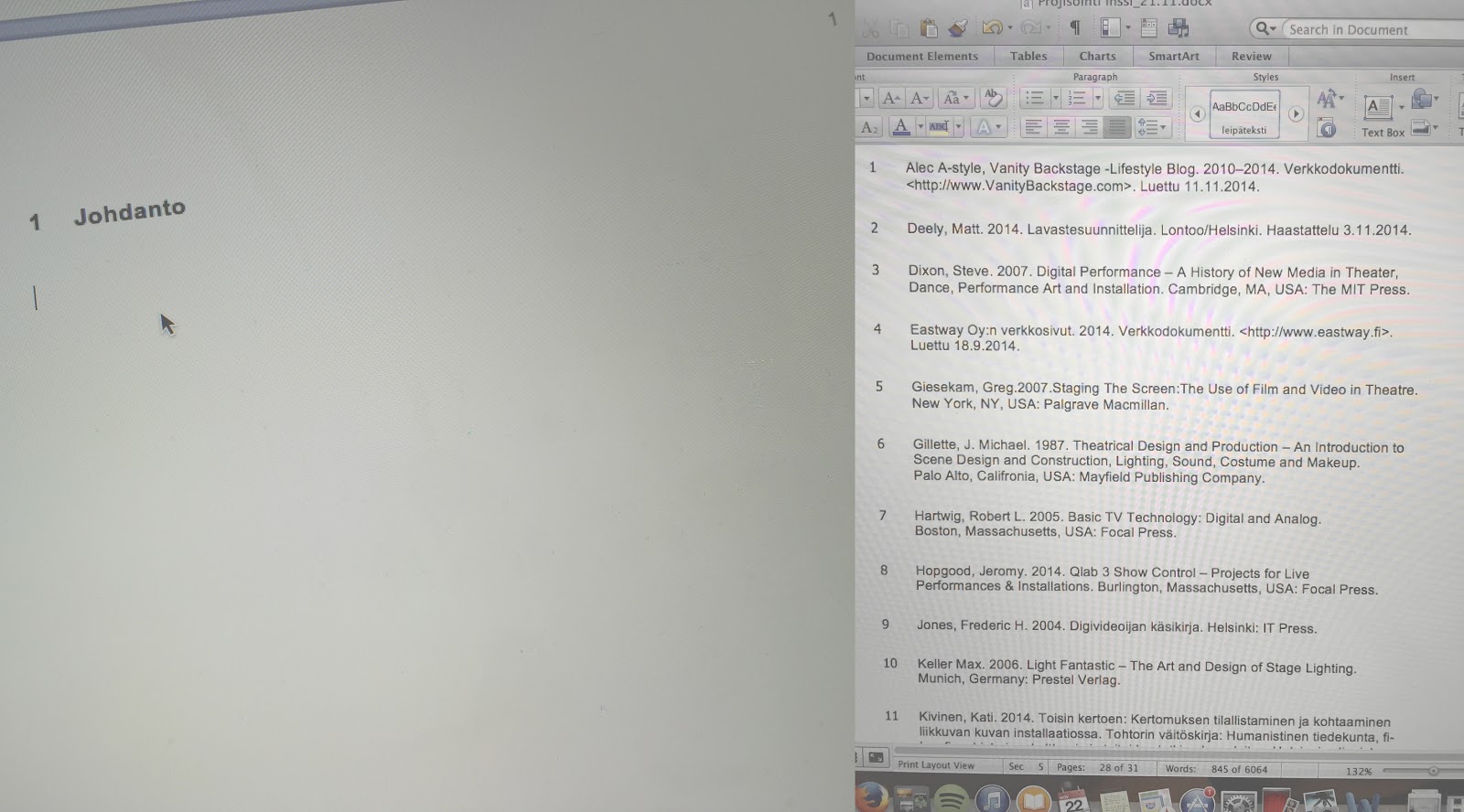 Opin asiat yleensä kantapään kautta, ja niinhän se tässäkin kävi! XD Aloitin (onnekseni sentään) lopputyöideoinnin jo syksyllä 2013. Homma tarkentui siinä matkan varrella koko ajan, koska ehdin vaihtaa itse aihettakin useampaan kertaan - kun niin moni asia olisi kiinnostanut. Mediatekniikkakin on alana hirveän laaja. Koin lopullisen täyskäännöksen siinä kevät-kesällä 2014. Pääsin kirjoittamaan itse inssityötä vasta lokakuussa (!!!) - siis kaksi kuukautta ennen suunniteltua valmistumistani - en todellakaan suosittele tällaista aikataulua kenellekään. Keräsin toki erinnäistä materiaalia jo ennen lokakuuta; paneuduin esim. lopputyökirjallisuuten jo siinä syyskuun lopulla. Ilman kyseistä pohjatyötä koko lopputyön kirjoittaminen olisi muodostunut täydeksi mahdottomuudeksi. Valitsin siis lopputyöaiheeksi projisoinnit ja konsertit. Aihealuetta on yhä nykyäänkin tutkittu hyvin niukasti. Suomalaista alan kirjallisuutta ei käytännössä edes ollut, vaan kaiken joutui kirjaimellisesti kaivelemaan ulkomaalaisista kirjoista ja muista lähteistä. Tuokin tosin osoittautui kovaksi haasteeksi, sillä suurin osa relevantista alan kirjallisuudesta oli peräisin peräti 1980- ja 1990-luvuilta!