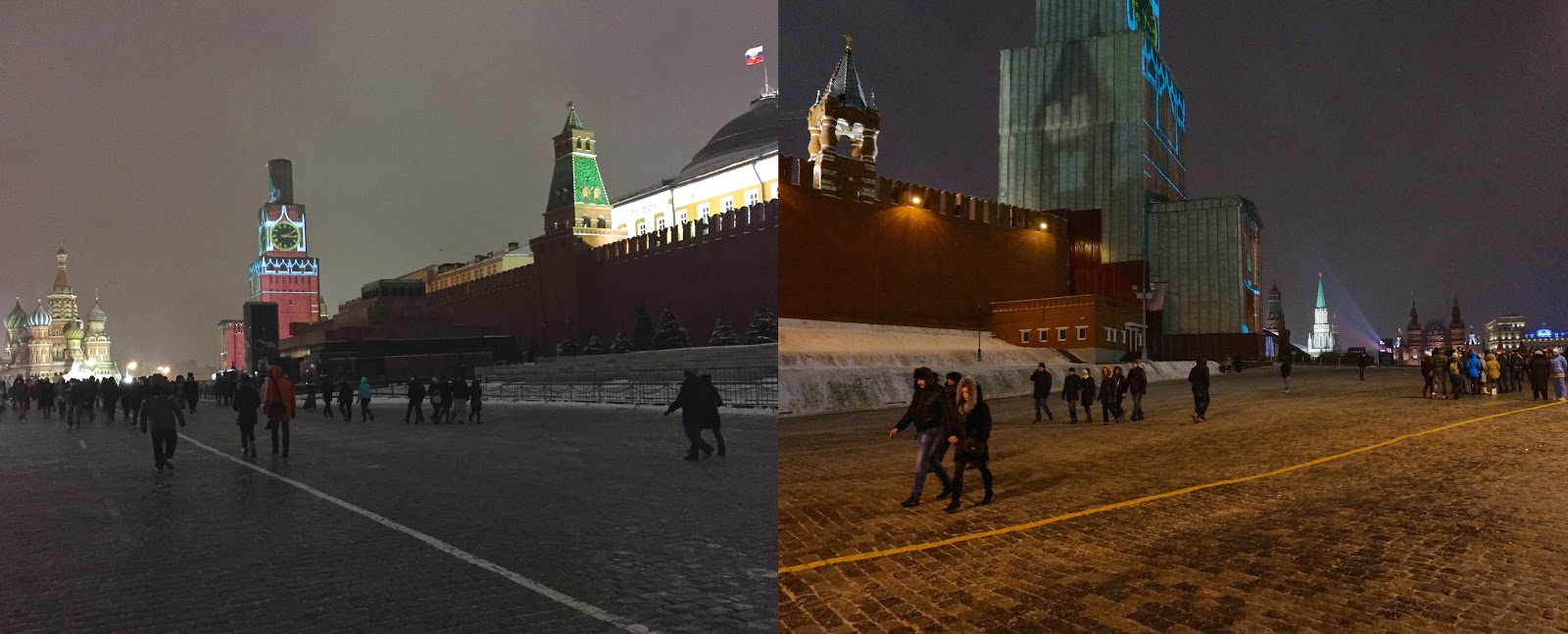 | Punaisella torilla oli kaksi tällaista projektoritolppaa, jossa kussakin näytti olevan neljä projektoria eli yhteensä kahdeksan projektoria! Kyseessä oli erittäin valovoimaiset laitteet, sillä ulkokäytössä vaaditaankin hyvin tehokkaita laitteita, jotta projisointi onnistuisi. Laitteet heijastivat kuvaa Kremlinin torniin, joka oli laitettu tätä tarkoitusta varten ns. pakettiin tietyntyyppisillä projisointikankailla. |