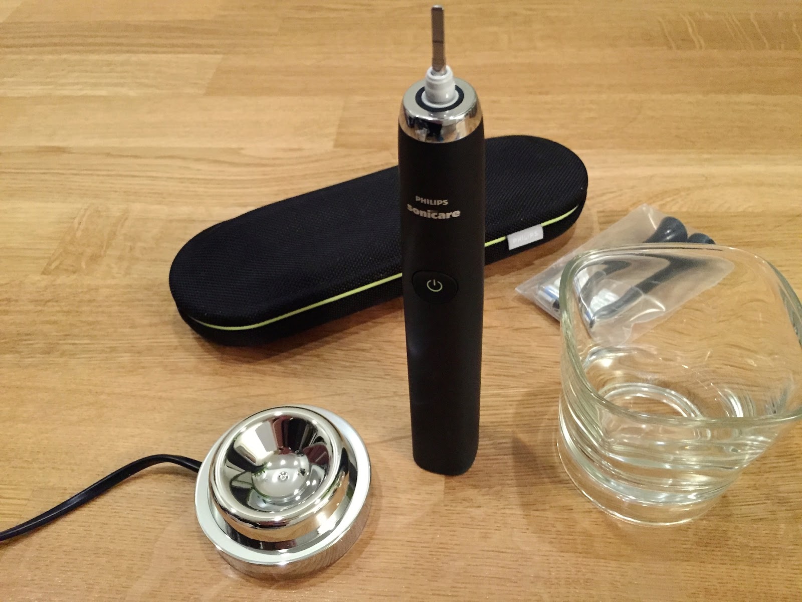 | Tässäpä tämä Philips Sonicare DiamondCleanin erikoisuudet: itsestään latautuvat induktiolasi sekä matkakotelo! |