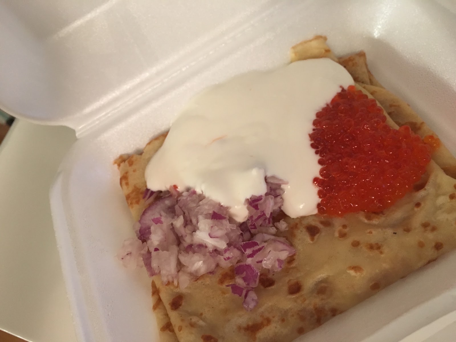 | Blini mädillä, sipulilla ja smetanalla. YUM! Kiitos Sturenkadun BLINIt-ravintola! Annos Foodoran toimittamana. |