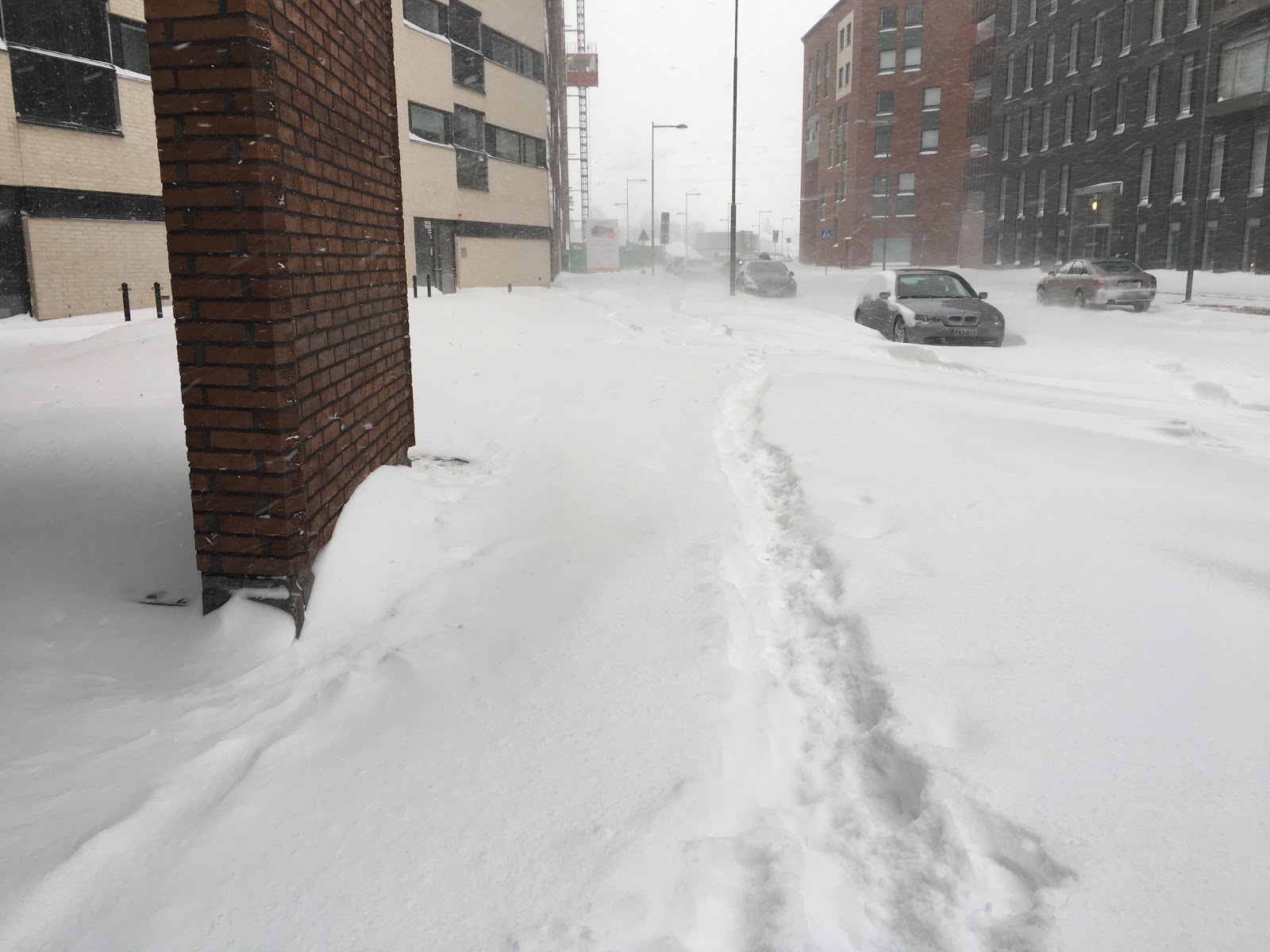| Lumimyräkkä oli ilmeinen. Kaikki paikat olivat lumen peitossa. Hyvä kun sai ulko-ovetkin auki! |